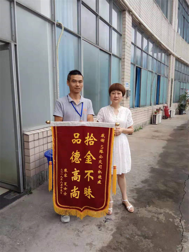 8月20日上午,市民夏女士冒著小雨來到公交總站,親手將一面寫有“拾金不昧品德高尚”的錦旗送到5路公交車司機饒建手上。送上錦旗時,夏女士口中還在不停的念叨著:“公交司機師傅很棒,真的要感謝你喲。”
