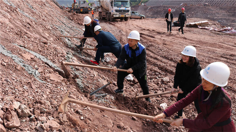 在活動現(xiàn)場,工程部部長劉太亮給大家介紹了雨名快速通道項目建設(shè)情況,高邊坡支護班組相關(guān)負責(zé)人現(xiàn)場指導(dǎo)高邊坡支護防護工作。全體黨員、入黨積極分子和公司其他員工在工程管理人員指導(dǎo)下,揮鎬舞鋤,積極參與勞動體驗。