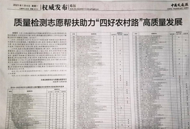 2020年12月30日,佳岳公司收到來自交通運輸部安全與質(zhì)量監(jiān)督管理司的感謝信,并在1月4日中國交通報6版以《質(zhì)量檢測志愿幫扶助力“四好農(nóng)村路”高質(zhì)量發(fā)展》為題進行了專題報道,對交建集團佳岳檢測公司在農(nóng)村公路、扶貧公路質(zhì)量檢測志愿幫扶工作中作出的不懈努力和無私奉獻表示感謝。