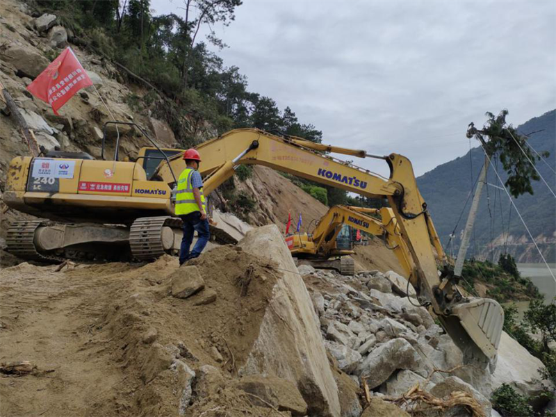 搶險(xiǎn)隊(duì)伍,馬上出發(fā)!集團(tuán)領(lǐng)導(dǎo)班子立即召開碰頭會(huì),分析研判形勢(shì),安排部署工作,密切關(guān)注震區(qū)態(tài)勢(shì),成立抗震救災(zāi)領(lǐng)導(dǎo)小組,副總經(jīng)理鐘焱宇率現(xiàn)場(chǎng)指揮組趕赴石棉靠前指揮搶險(xiǎn)救災(zāi)。正在石棉G108線施工的康藏路橋公司項(xiàng)目部組成10人搶險(xiǎn)救援小分隊(duì),攜帶挖掘機(jī)4臺(tái)、拖車4臺(tái)、裝載機(jī)3臺(tái)、交通運(yùn)輸車2輛、無人機(jī)1臺(tái),第一時(shí)間到就地?fù)岆U(xiǎn)工作,震后7小時(shí),完成國(guó)道G108線馬富至菩薩崗約40公里路段、6處塌方點(diǎn)1600余方土石方清理,爾后轉(zhuǎn)戰(zhàn)石棉縣新民鄉(xiāng)進(jìn)行通鄉(xiāng)道路搶通作業(yè)。