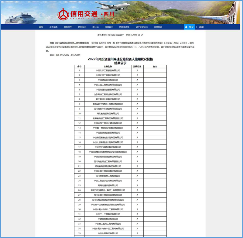 近日,四川省交通運輸廳“信用交通(四川)”公示2022年擬投資四川省高速公路投資人信用狀況復核結果和2022年第3批擬投資四川省高速公路投資人初次信用評價結果,雅安市交通建設(集團)有限責任公司及下屬全資子公司四川康藏路橋有限責任公司獲得“A”級信用評價。