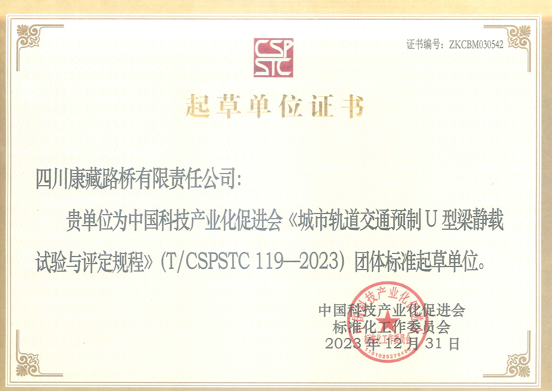 日前,雅安市交通建設(集團)有限責任公司收到中國科技產(chǎn)業(yè)化促進會頒發(fā)的《城市軌道交通預制U型梁靜載試驗與評定規(guī)程》(T/CSPSTC119-2023)團體標準起草單位證書,路橋公司參與起草的《城市軌道交通預制U型梁靜載試驗與評定規(guī)程》團體標準,于2023年12月31日正式發(fā)布實施。