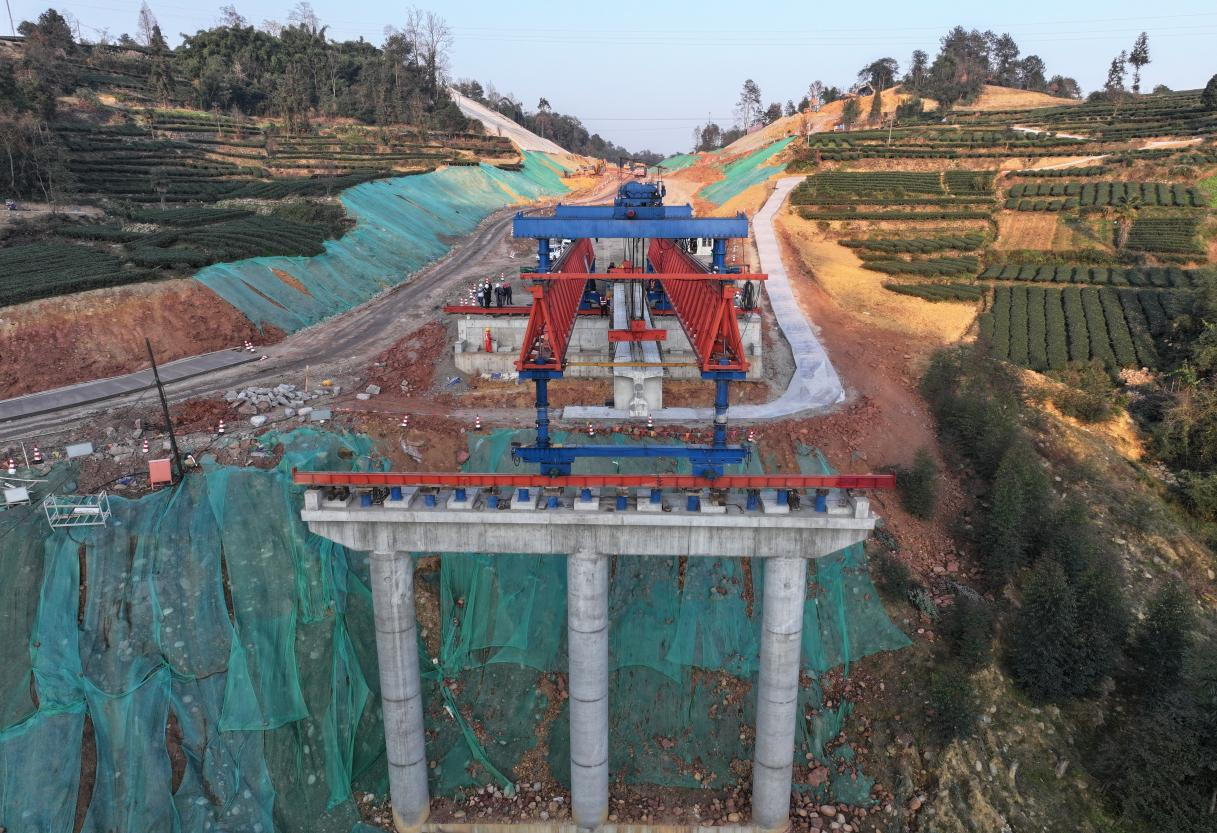 流水化施工,大力提升了架梁效率與作業(yè)安全性。截至目前,馬家溝1號橋建設取得關鍵進展,第一跨首片梁已順利完成架設。這一突破標志著橋梁施工正式進入快速推進階段,為后續(xù)馬家溝2號橋的架設及全線橋梁貫通邁出關鍵性的一步。