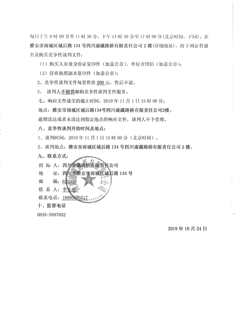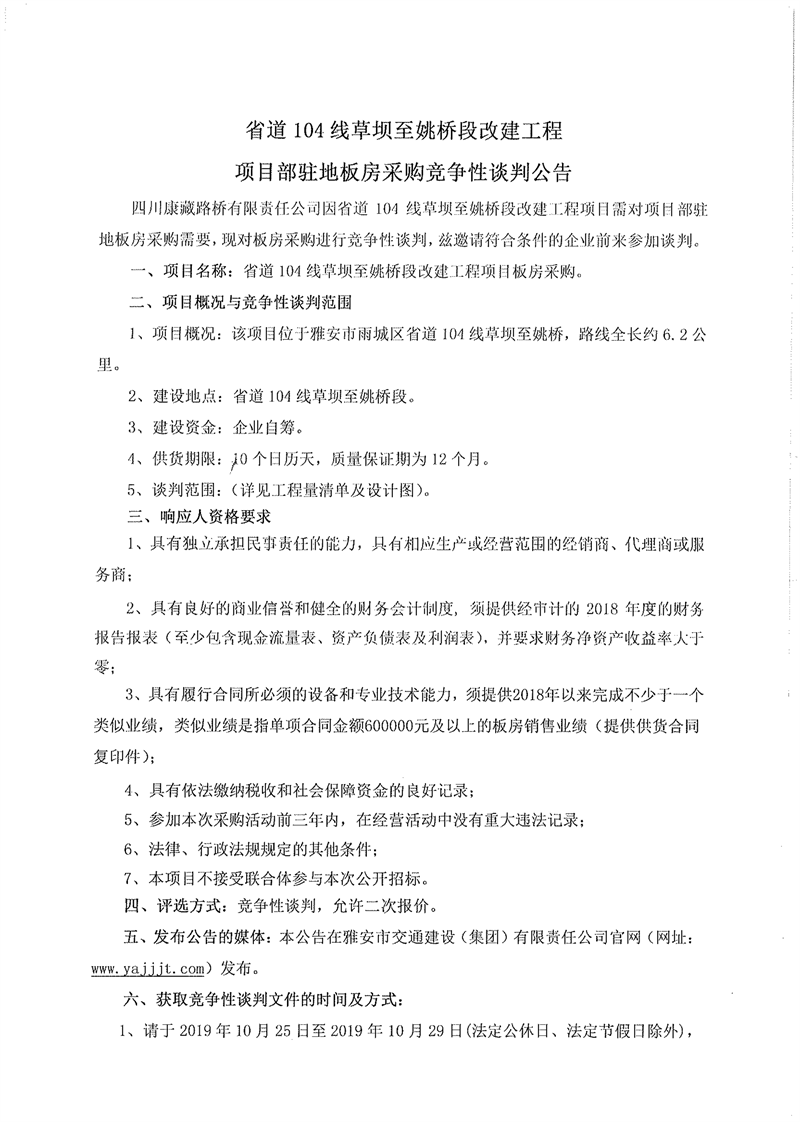 四川康藏路橋有限責任公司省道104線草壩至姚橋段改建工程項目部駐地板房采購競爭性談判公告