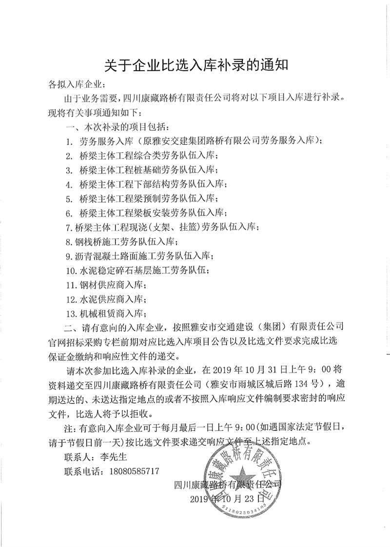 四川康藏路橋有限責任公司關(guān)于企業(yè)比選入庫補錄的通知