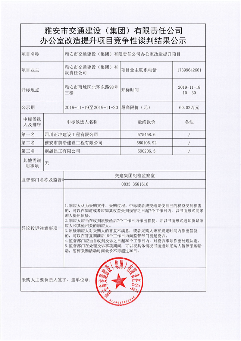 雅安市交通建設(shè)(集團(tuán))有限責(zé)任公司辦公室改造提升項目競爭性談判結(jié)果公示