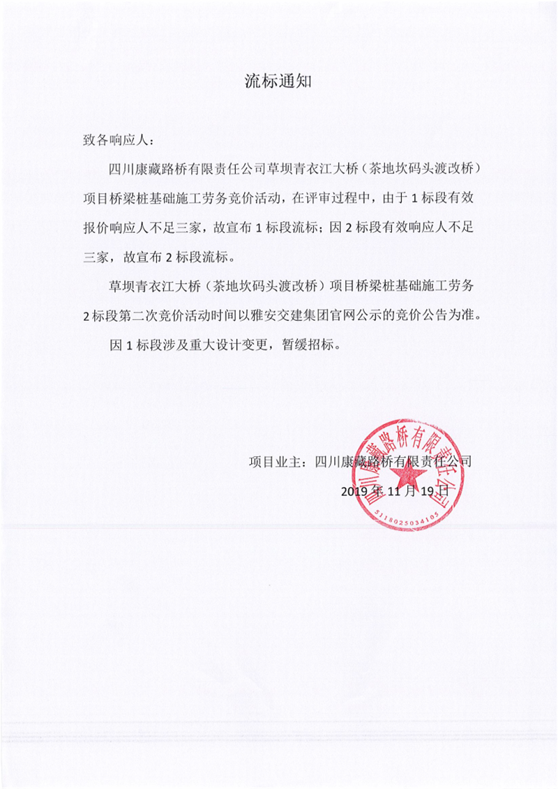 四川康藏路橋有限責(zé)任公司草壩青衣江大橋(茶地坎碼頭渡改橋)項(xiàng)目橋梁樁基礎(chǔ)施工勞務(wù)競(jìng)價(jià)(1標(biāo)段、2標(biāo)段)流標(biāo)通知