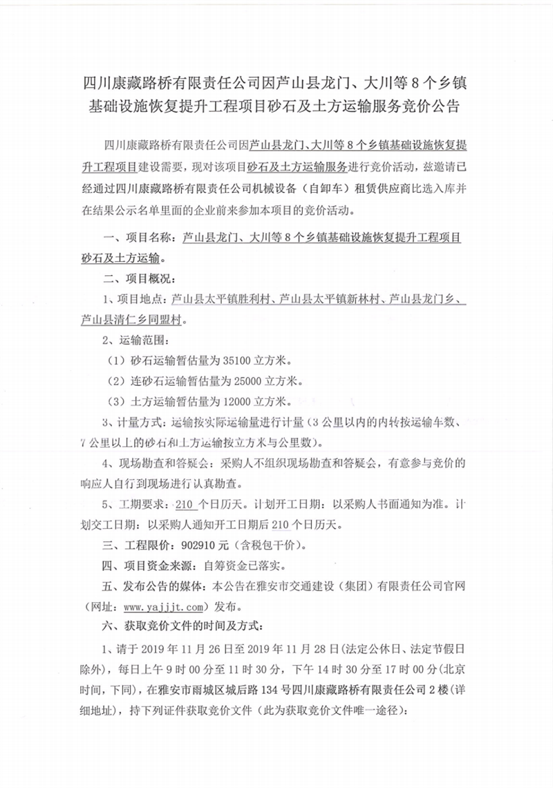四川康藏路橋有限責(zé)任公司蘆山縣龍門、大川等8個(gè)鄉(xiāng)鎮(zhèn)基礎(chǔ)設(shè)施恢復(fù)提升工程項(xiàng)目砂石及土方運(yùn)輸服務(wù)競價(jià)公告
