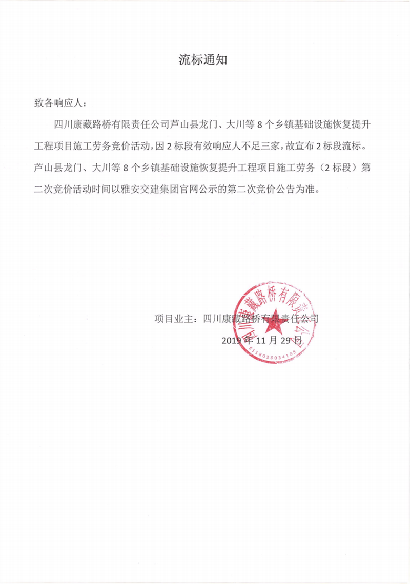 四川康藏路橋有限責(zé)任公司蘆山縣龍門、大川等8個鄉(xiāng)鎮(zhèn)基礎(chǔ)設(shè)施恢復(fù)提升工程項(xiàng)目施工勞務(wù)(2標(biāo)段)競價流標(biāo)通知