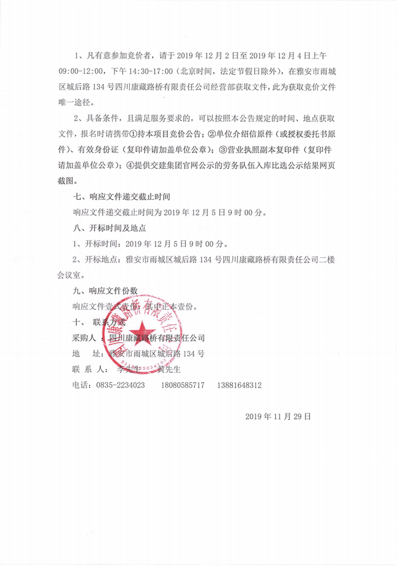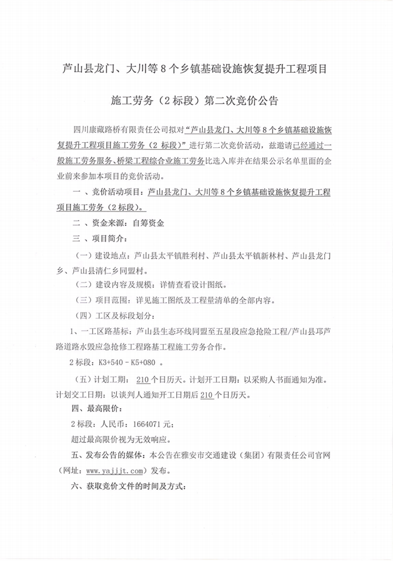 四川康藏路橋有限責(zé)任公司蘆山縣龍門、大川等8個鄉(xiāng)鎮(zhèn)基礎(chǔ)設(shè)施恢復(fù)提升工程項目施工勞務(wù)(2標(biāo)段)第二次競價公告