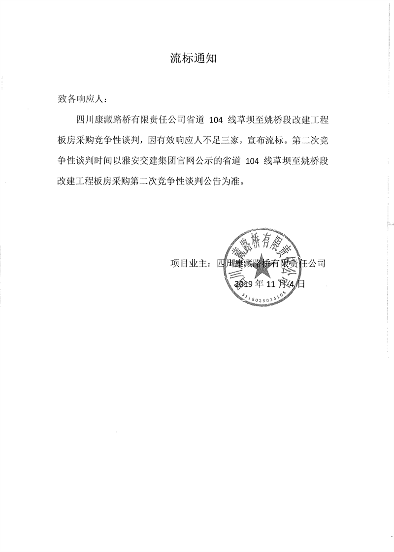 四川康藏路橋有限責任公司省道104線草壩至姚橋段改建工程板房采購項目流標通知