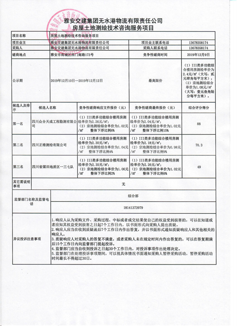 雅安交建集團無水港物流有限責任公司房屋土地測繪技術咨詢服務項目競爭性磋商結(jié)果公示
