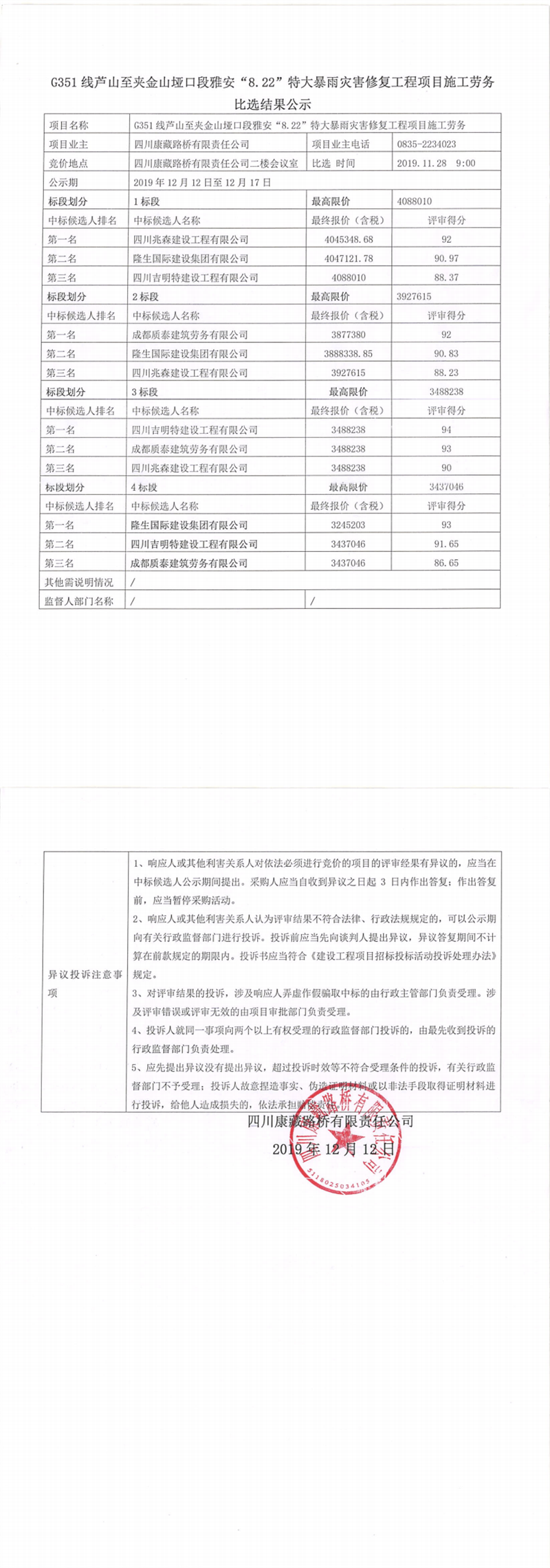 四川康藏路橋有限責(zé)任公司G351線蘆山至夾金山埡口段雅安“8.22”特大暴雨災(zāi)害修復(fù)工程項(xiàng)目施工勞務(wù)比選結(jié)果公示