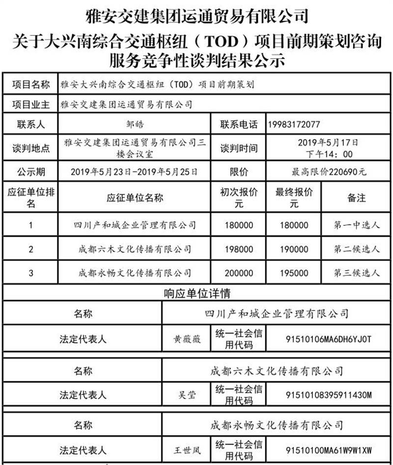 雅安交建集團運通貿易有限公司關于大興南綜合樞紐(TOD)項目前期策劃咨詢服務競爭性談判結果公司