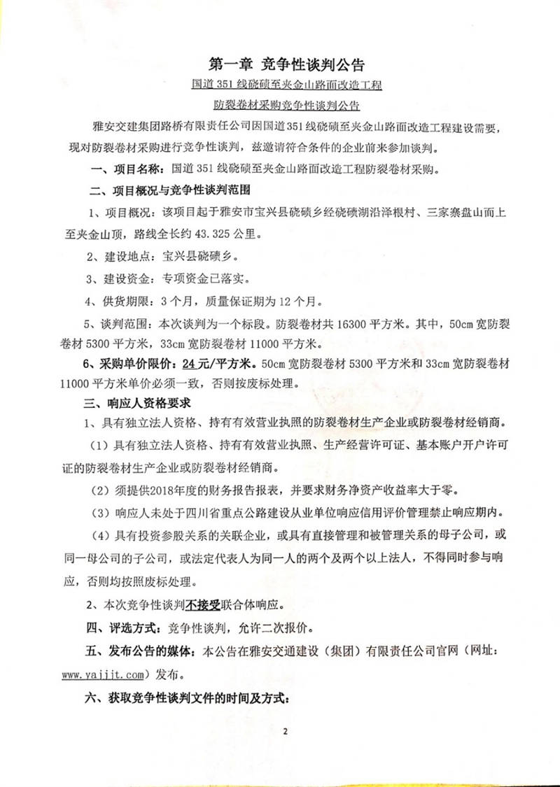 雅安交建集團(tuán)路橋有限責(zé)任公司國道351線磽磧至夾金山路面改造工程防裂卷材采購競爭性談判公告