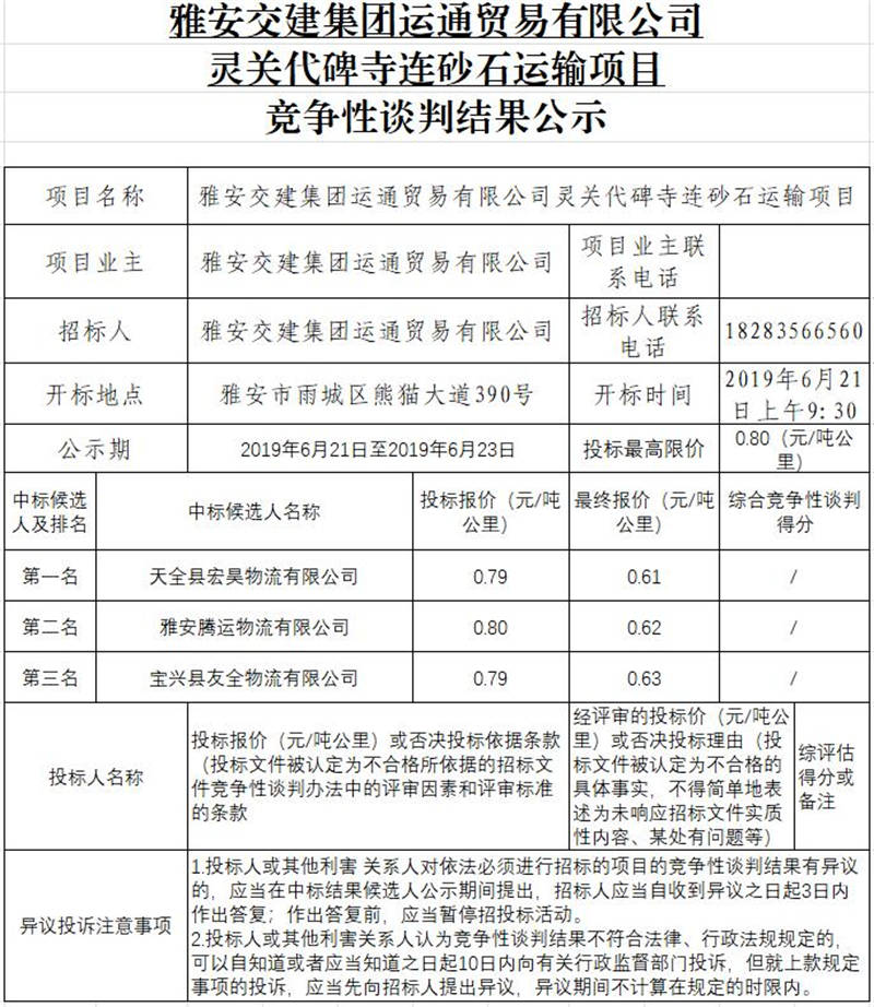 雅安交建集團(tuán)運(yùn)通貿(mào)易有限公司靈關(guān)代碑寺連砂石運(yùn)輸項(xiàng)目競(jìng)爭性談判結(jié)果公示