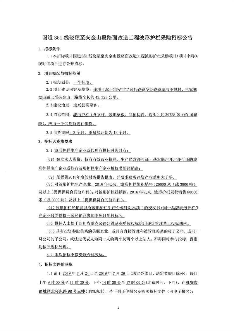 雅安交建集團(tuán)路橋有限責(zé)任公司國(guó)道351線磽磧至夾金山段路面改造工程波形護(hù)欄采購(gòu)招標(biāo)公告