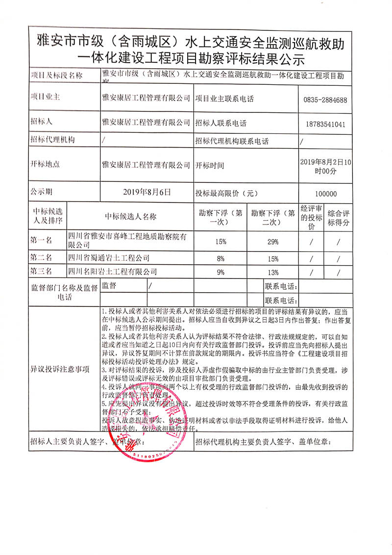 雅安康居工程管理有限公司雅安市市級(含雨城區(qū))水上交通安全監(jiān)測巡航救助一體化建設工程項目勘察評標結果公示