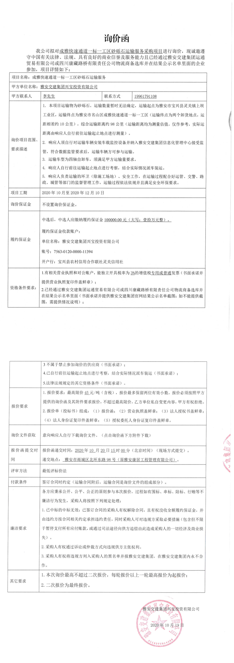 雅安交建集團(tuán)興寶投資有限公司成雅快速通道一標(biāo)一工區(qū)砂礫石運(yùn)輸服務(wù)采購項目詢價函