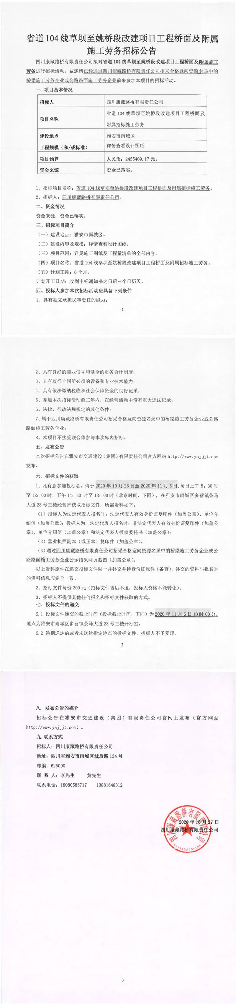 四川康藏路橋有限責(zé)任公司省道104線(xiàn)草壩至姚橋段改建項(xiàng)目工程橋面及附屬施工勞務(wù)招標(biāo)公告