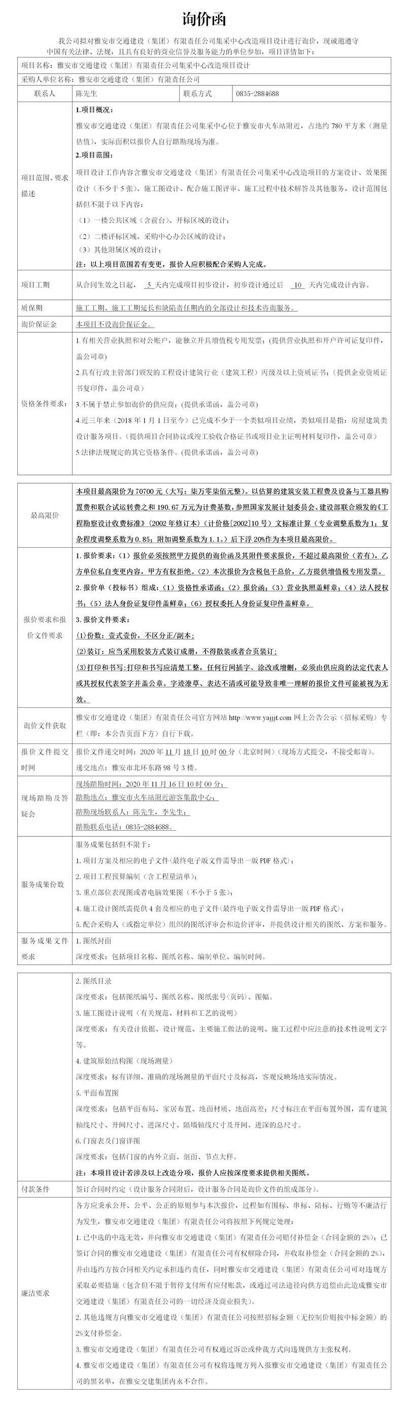 雅安市交通建設(集團)有限責任公司集采中心改造項目設計詢價公告