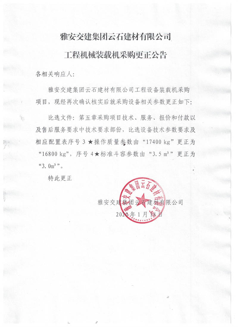 雅安交建集團云石建材有限公司工程機械裝載機采購更正公告