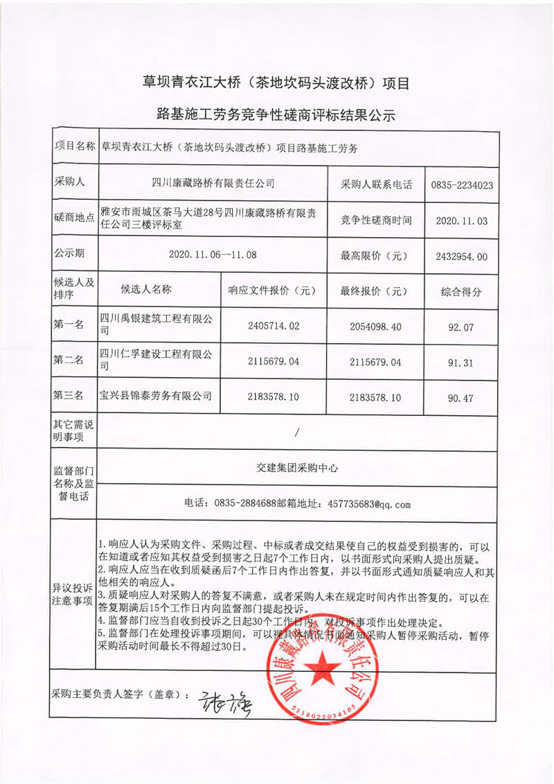 四川康藏路橋有限責任公司草壩青衣江大橋(茶地坎碼頭渡改橋)項目路基施工勞務(wù)競爭性磋商評標結(jié)果公示