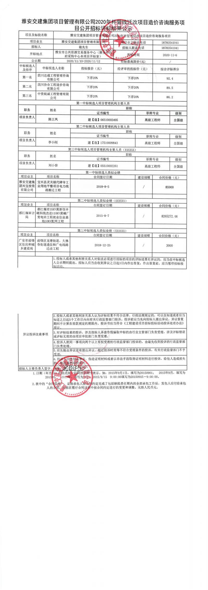 雅安交建集團(tuán)項(xiàng)目管理有限公司2020年桿管線遷改項(xiàng)目造價(jià)咨詢服務(wù)項(xiàng)目公開招標(biāo)評標(biāo)結(jié)果公示