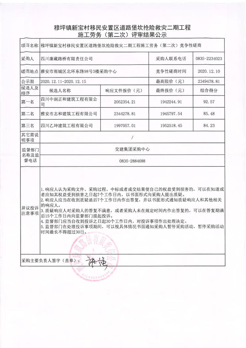 四川康藏路橋有限責任公司穆坪鎮(zhèn)新寶村移民安置區(qū)道路堡坎搶險救災二期工程施工勞務(wù)(第二次)評審結(jié)果公示