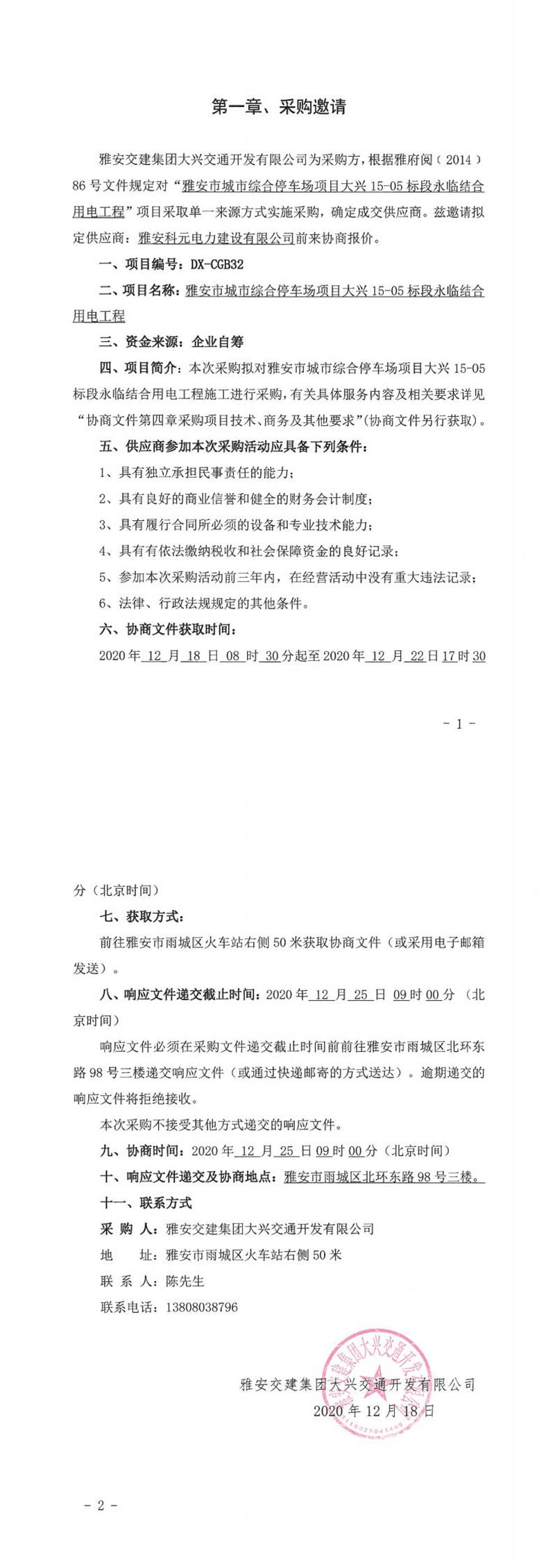 雅安交建集團(tuán)大興交通開發(fā)有限公司雅安市城市綜合停車場項目大興15-05標(biāo)段永臨結(jié)合用電工程單一來源采購邀請
