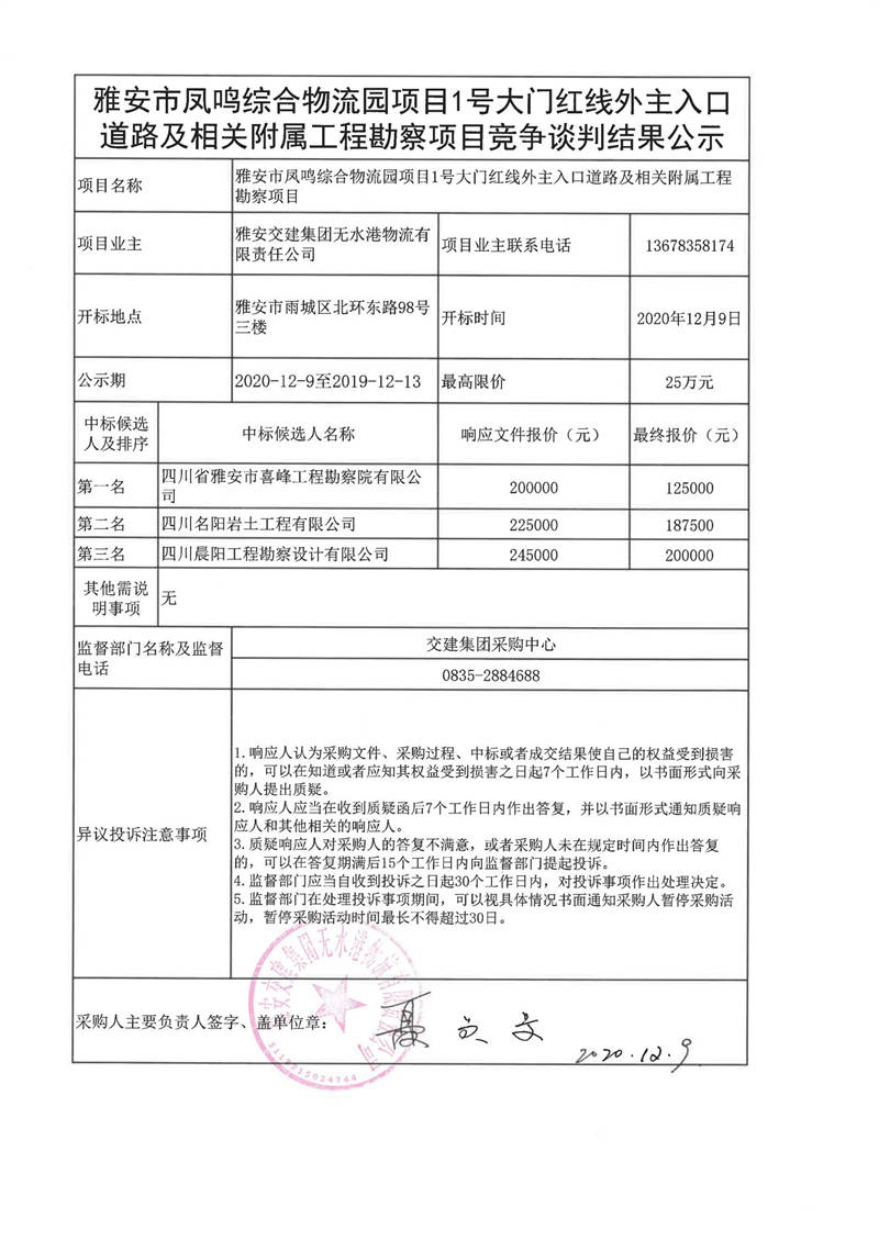 雅安交建集團(tuán)無(wú)水港物流有限責(zé)任公司雅安市鳳鳴綜合物流園項(xiàng)目1號(hào)大門紅線外主入口道路及相關(guān)附屬工程勘察項(xiàng)目競(jìng)爭(zhēng)談判結(jié)果公示