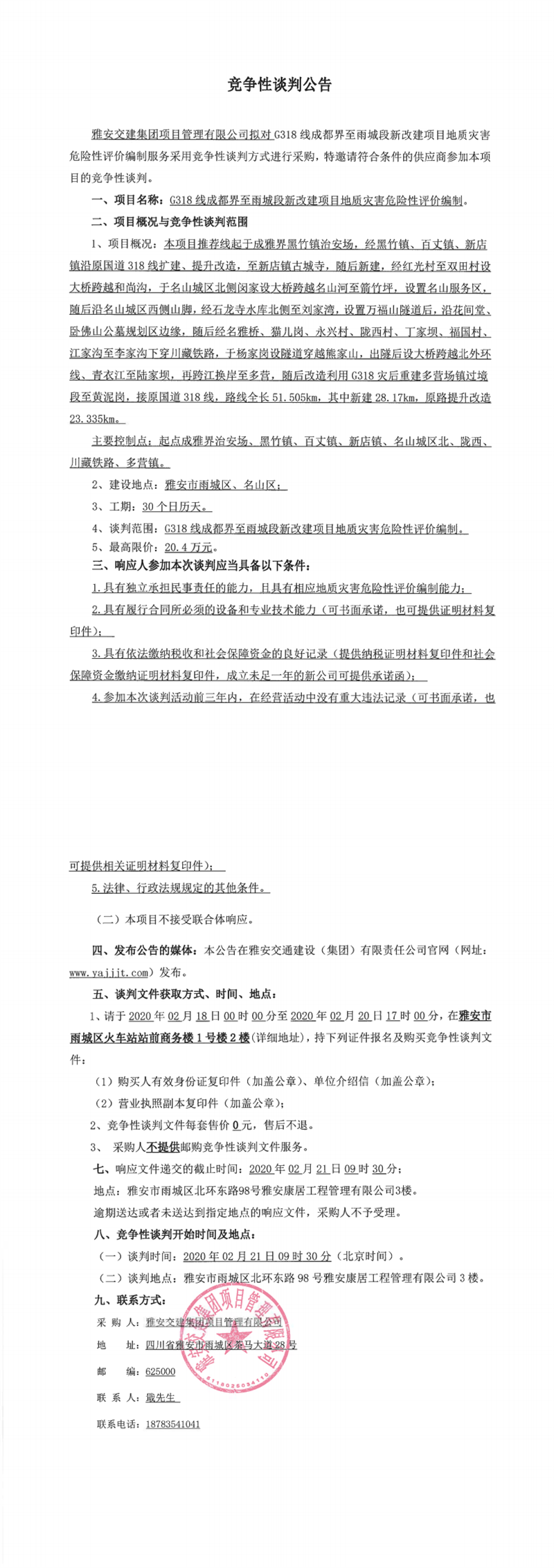 雅安交建集團(tuán)項(xiàng)目管理有限公司G318線成都界至雨城段新改建項(xiàng)目地質(zhì)災(zāi)害危險(xiǎn)性評(píng)價(jià)編制競(jìng)爭(zhēng)性談判公告