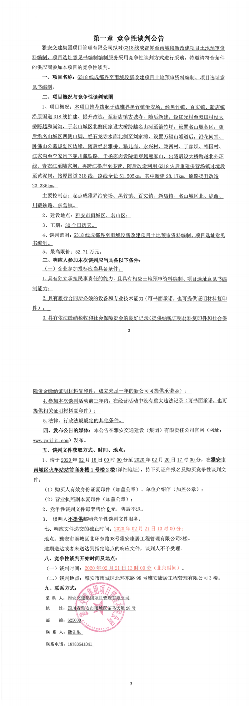 雅安交建集團(tuán)項(xiàng)目管理有限公司G318線成都界至雨城段新改建項(xiàng)目土地預(yù)審資料編制、項(xiàng)目選址意見書編制競(jìng)爭(zhēng)性談判公告