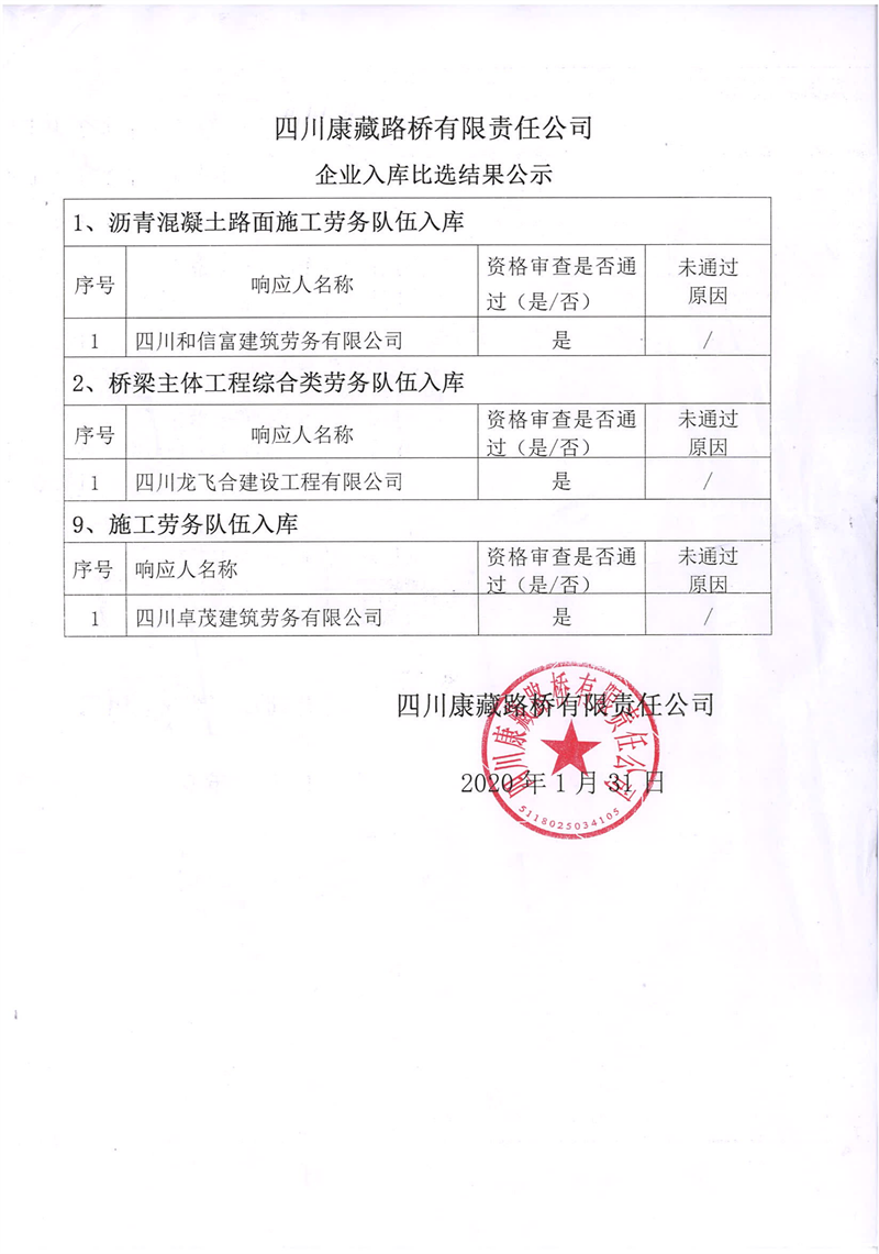四川康藏路橋有限責(zé)任公司企業(yè)入庫比選結(jié)果公示