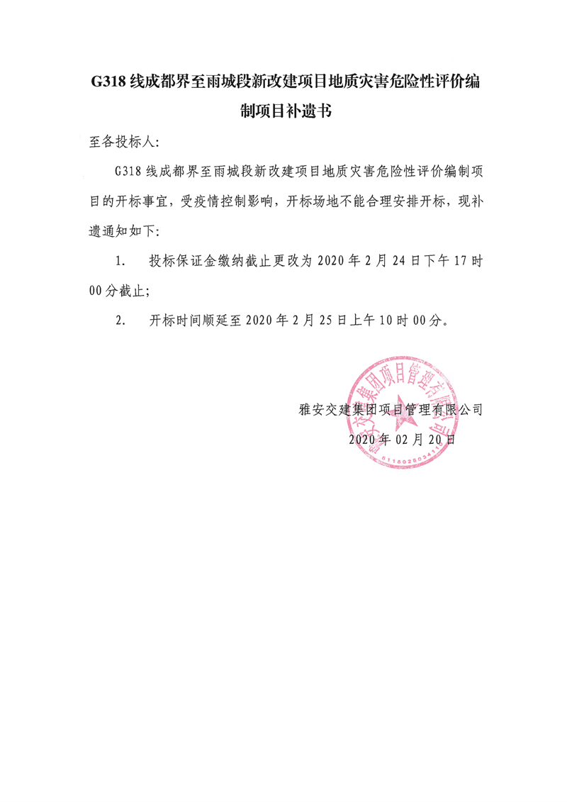 雅安交建集團項目管理有限公司G318線成都界至雨城段新改建項目地質災害危險性評價編制項目補遺書