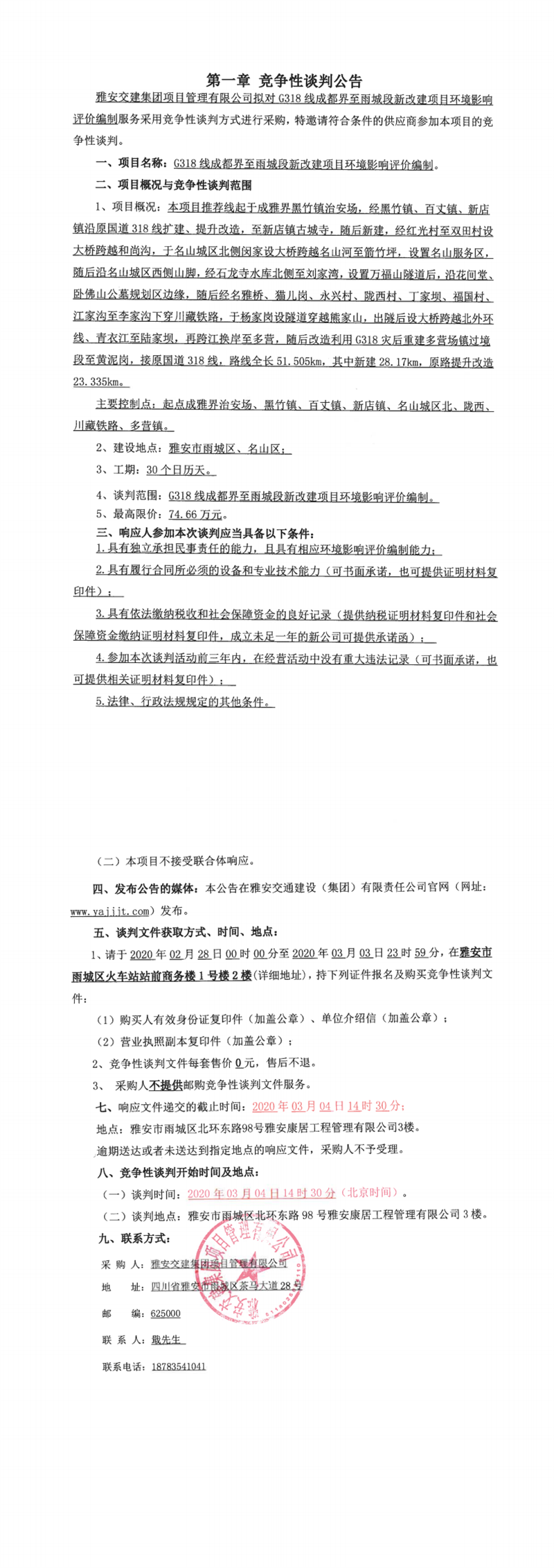 雅安交建集團(tuán)項目管理有限公司G318線成都界至雨城段新改建項目環(huán)境影響評價編制競爭性談判公告