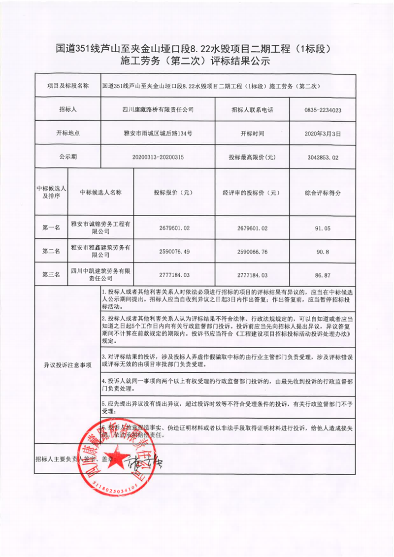 四川康藏路橋有限責(zé)任公司國道351線蘆山至夾金山埡口段8.22水毀項(xiàng)目二期工程(1標(biāo)段)施工勞務(wù)(第二次)評標(biāo)結(jié)果公示