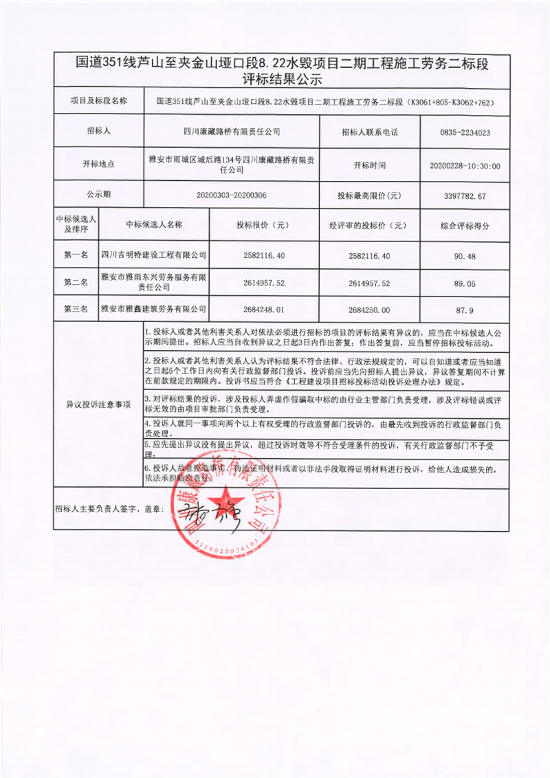 四川康藏路橋有限責(zé)任公司國道351線蘆山至夾金山埡口段8.22水毀項目二期工程施工勞務(wù)二標(biāo)段評標(biāo)結(jié)果公示