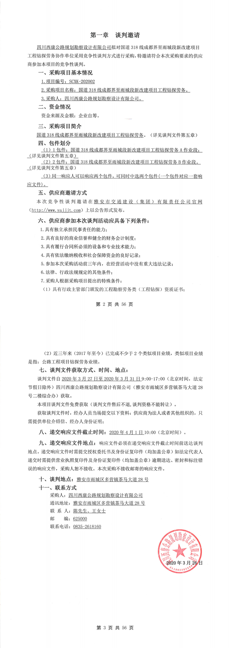 四川西康公路規(guī)劃勘察設(shè)計有限公司國道318線成都界至雨城段新改建項(xiàng)目工程鉆探勞務(wù)競爭性談判公告