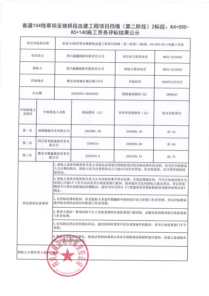 四川康藏路橋有限責(zé)任公司省道104線草壩至姚橋段改建工程項目擋墻(第二階段)2標(biāo)段:K4+050-K5+140施工勞務(wù)評標(biāo)結(jié)果公示