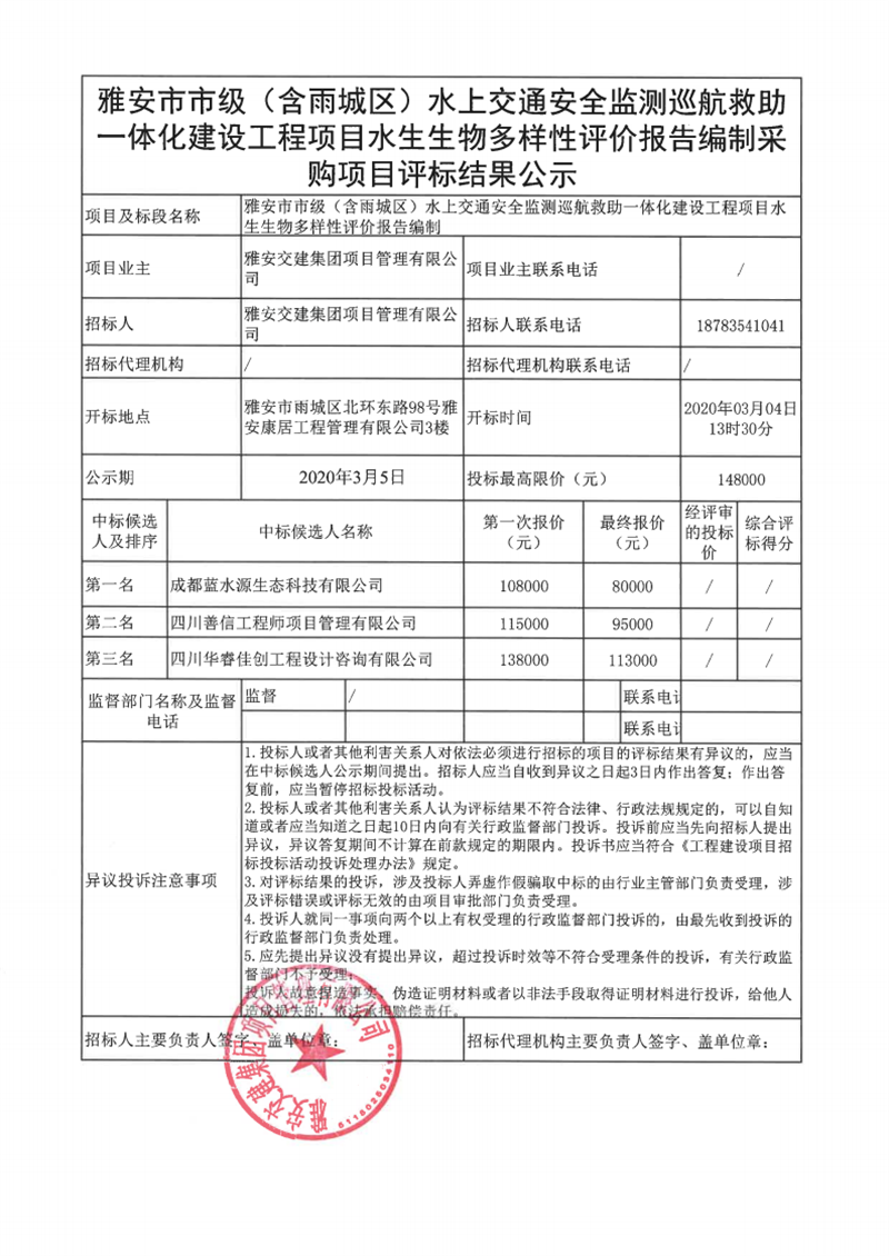 雅安交建集團(tuán)項(xiàng)目管理有限公司雅安市市級(jí)(含雨城區(qū))水上交通安全監(jiān)測(cè)巡航救助一體化建設(shè)工程項(xiàng)目水生生物多樣性評(píng)價(jià)報(bào)告編制采購項(xiàng)目評(píng)標(biāo)結(jié)果公示