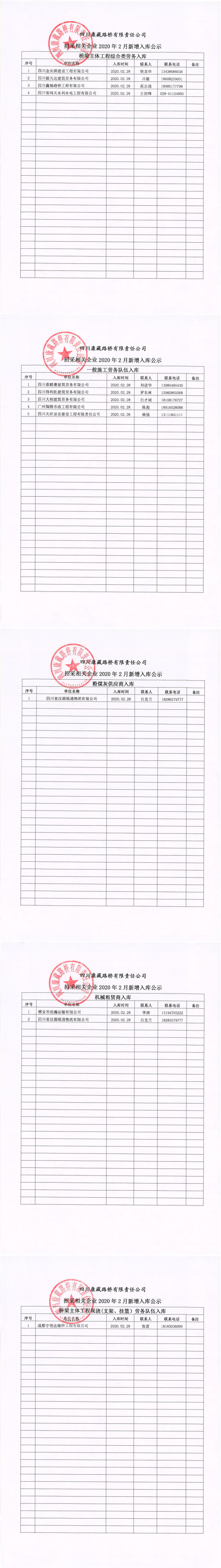 四川康藏路橋有限責(zé)任公司招采相關(guān)企業(yè)2020年2月新增入庫公示