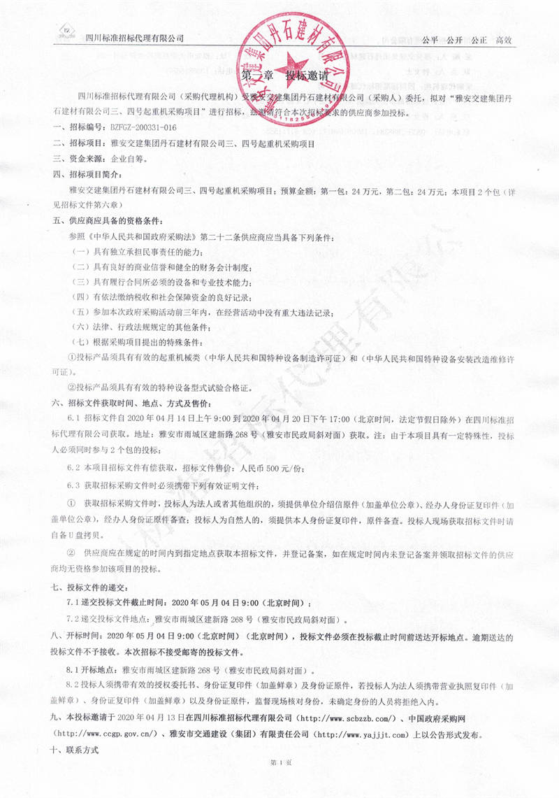 雅安交建集團(tuán)丹石建材有限公司三、四號起重機采購項目招標(biāo)公告