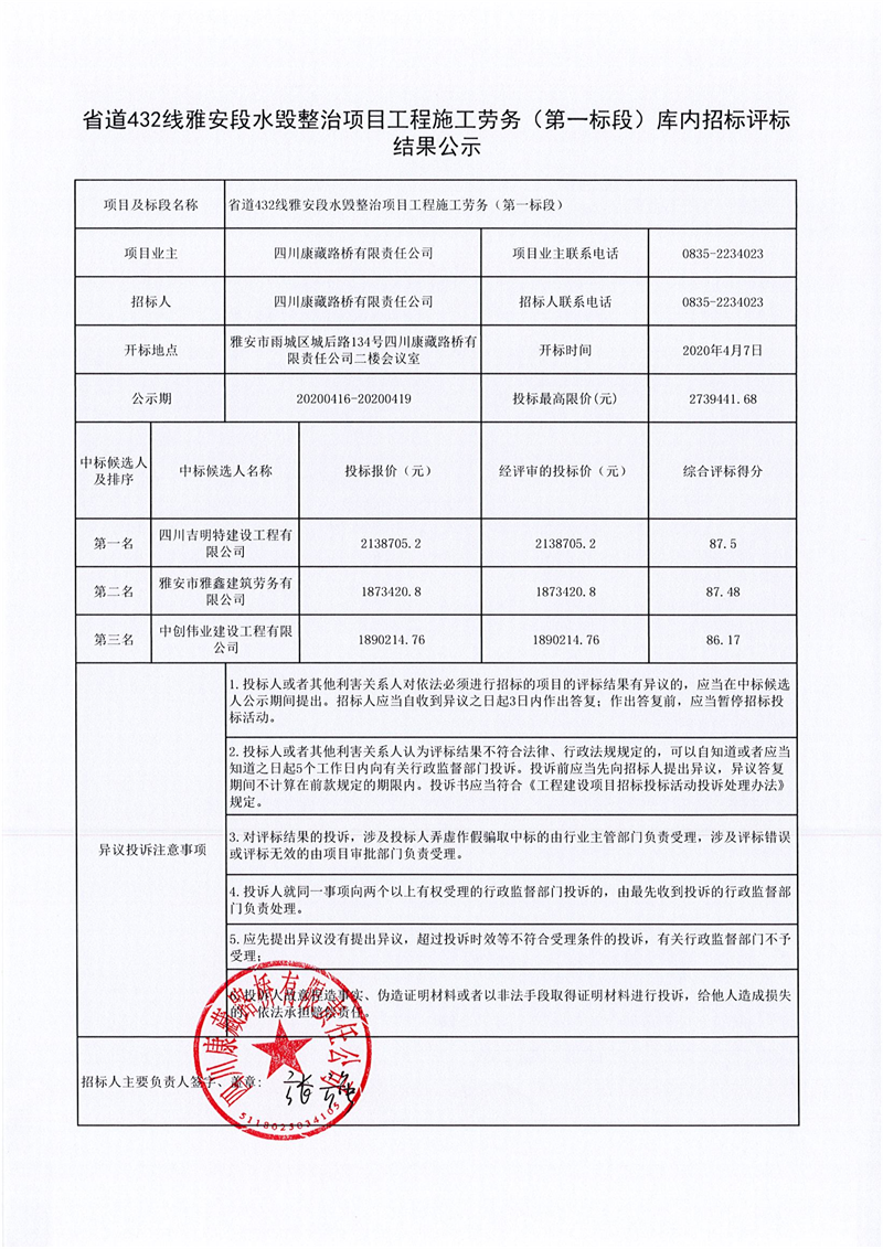 四川康藏路橋有限責(zé)任公司省道432線雅安段水毀整治項目工程施工勞務(wù)(第一標(biāo)段)庫內(nèi)招標(biāo)評標(biāo)結(jié)果公示