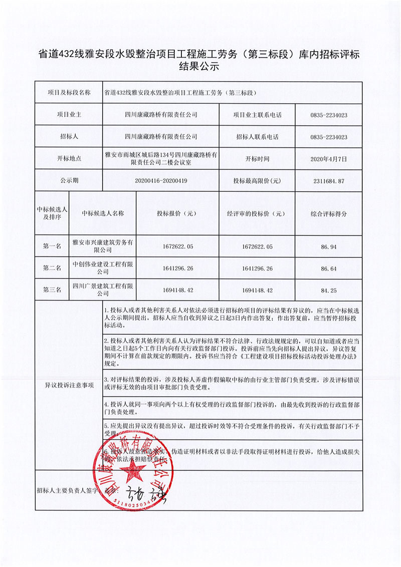 四川康藏路橋有限責任公司省道432線雅安段水毀整治項目工程施工勞務(第三標段)庫內(nèi)招標評標結果公示