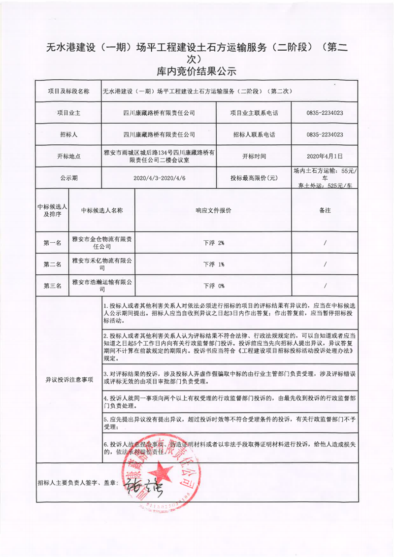四川康藏路橋有限責任公司無水港建設(一期)場平工程土石方運輸服務(二階段)(第二次)庫內競價結果公示