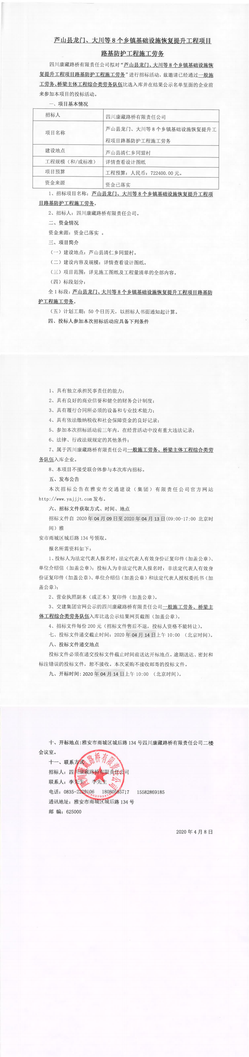 四川康藏路橋有限責(zé)任公司蘆山縣龍門、大川等8個(gè)鄉(xiāng)鎮(zhèn)基礎(chǔ)設(shè)施恢復(fù)提升工程項(xiàng)目路基防護(hù)工程施工勞務(wù)招標(biāo)公告