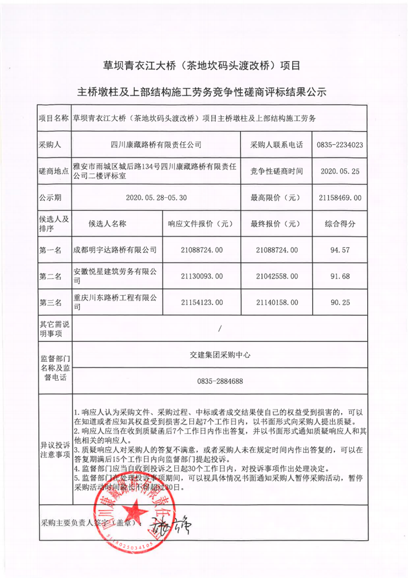 四川康藏路橋有限責(zé)任公司草壩青衣江大橋(茶地坎碼頭渡改橋)項(xiàng)目主橋墩柱及上部結(jié)構(gòu)施工勞務(wù)競爭性磋商評標(biāo)結(jié)果公示