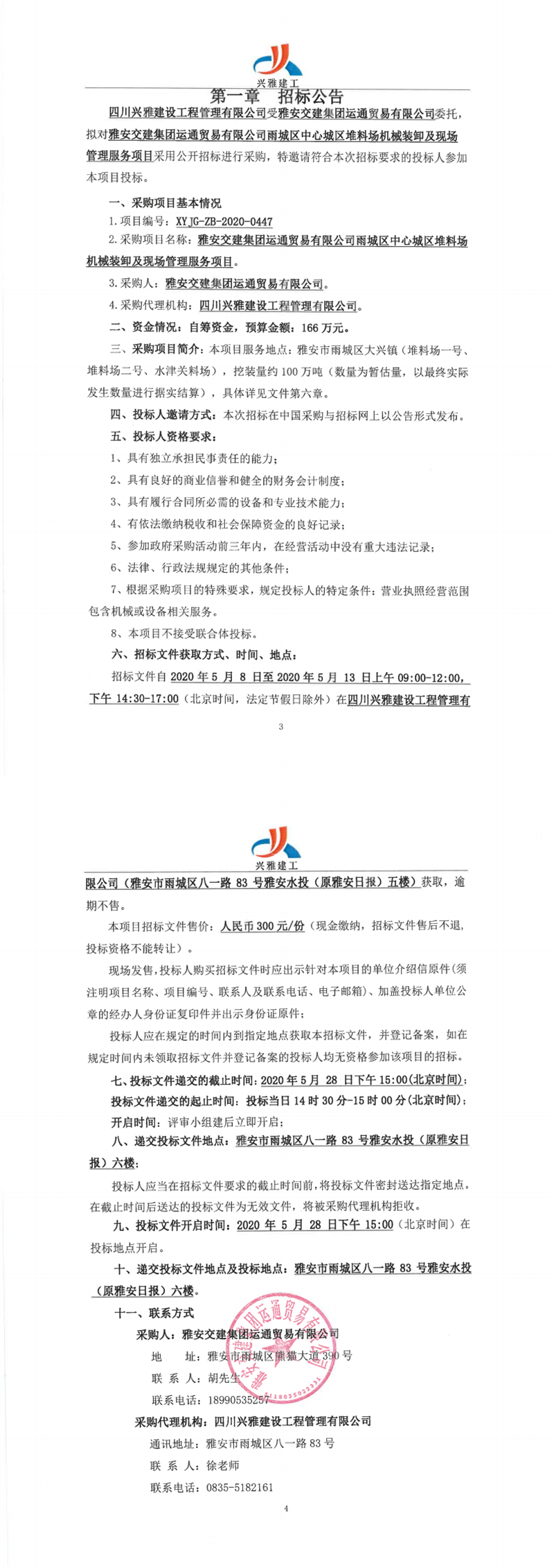 雅安交建集團運通貿(mào)易有限公司雨城區(qū)中心城區(qū)堆料場機械裝卸及現(xiàn)場管理服務項目招標公告