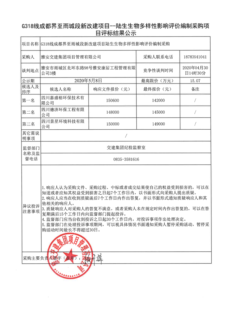 雅安交建集團項目管理有限公司G318線成都界至雨城段新改建項目陸生生物多樣性影響評價編制采購項目評標結(jié)果公示